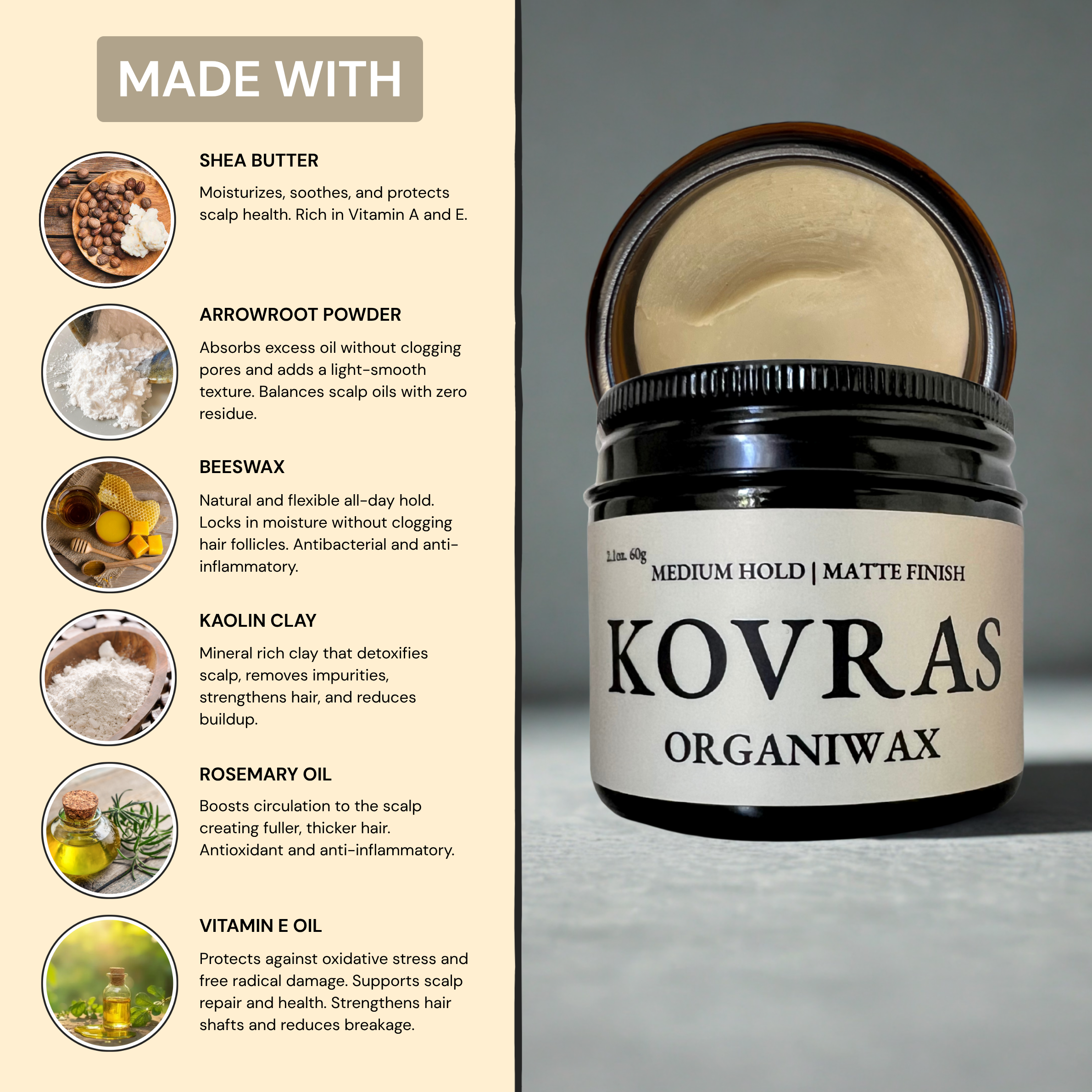 Organiwax is handmade in small batches using just 6 high-quality, all-natural ingredients. It delivers a medium hold with a true matte finish—without any synthetic chemicals, parabens, artificial fragrances, and other various lab-made ingredients that nobody can pronounce.