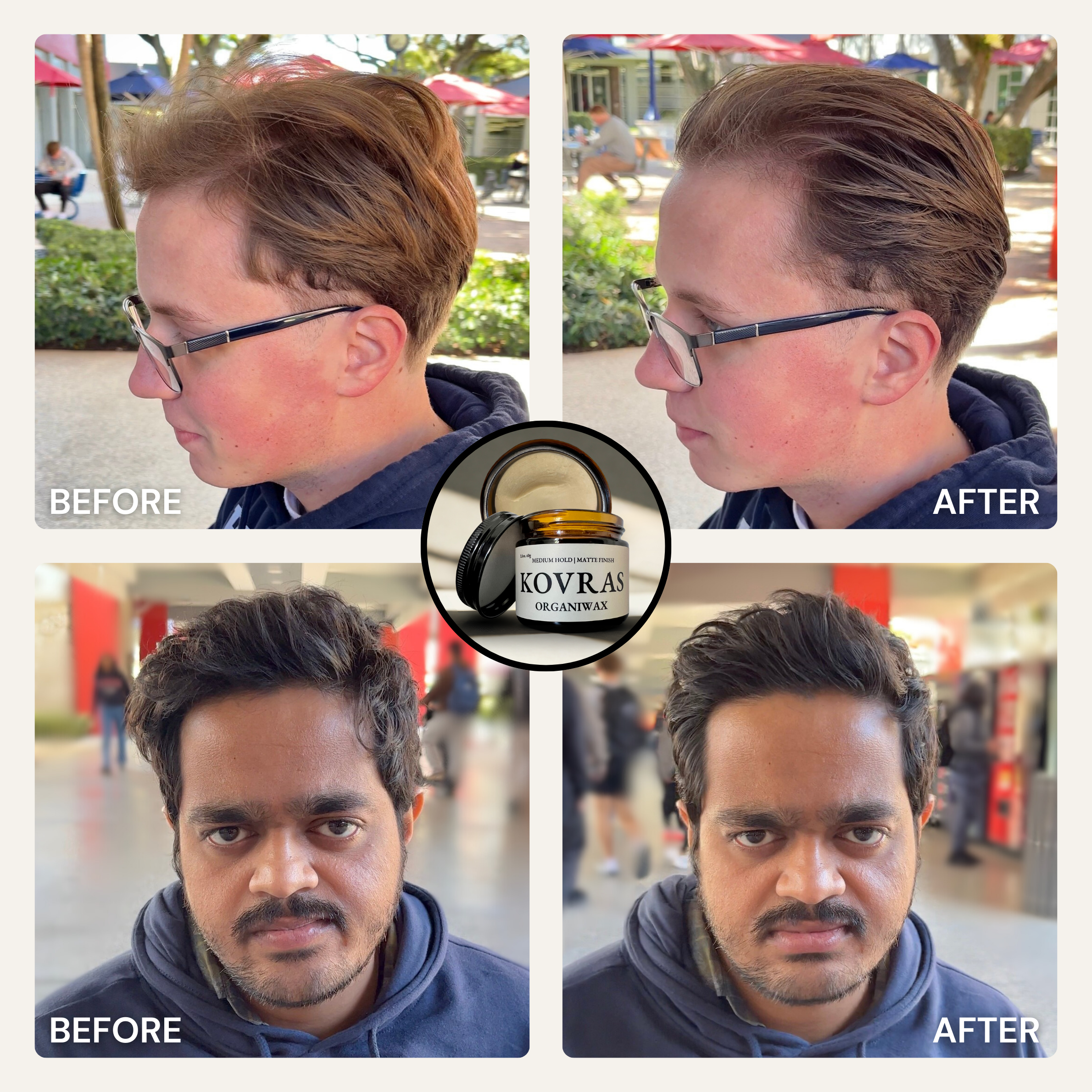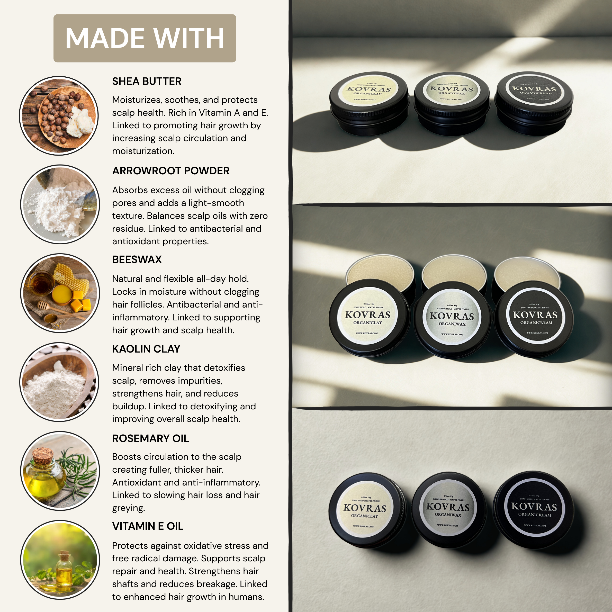 Organiclay, Organiwax, and Organicream are handmade in small batches using just 6 high-quality, all-natural ingredients. They deliver a high, medium, and low hold with a true matte finish—without any synthetic chemicals, parabens, artificial fragrances, and other various lab-made ingredients that nobody can pronounce.